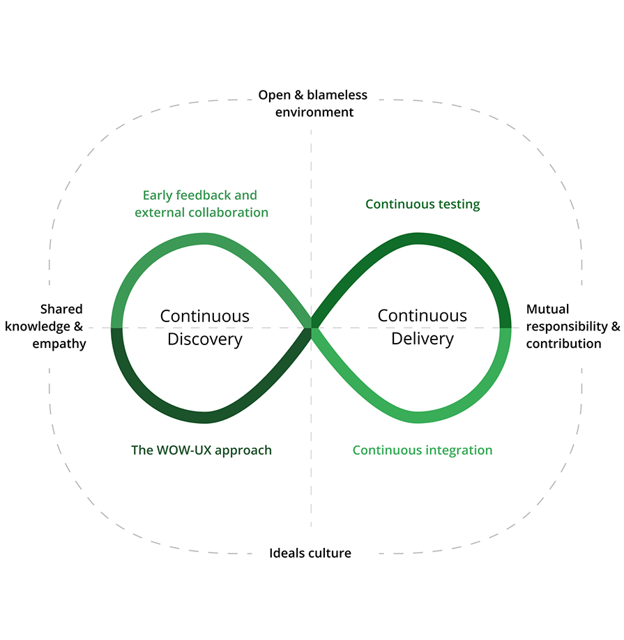 This doesn't end on the company level either — it goes deeper. Within our product and engineering organization, we have our own code of conduct where we recommend how to collaborate with others. We try to visualize this based on what we’ve built so far, and then combine it with continuous discovery and continuous delivery approaches: